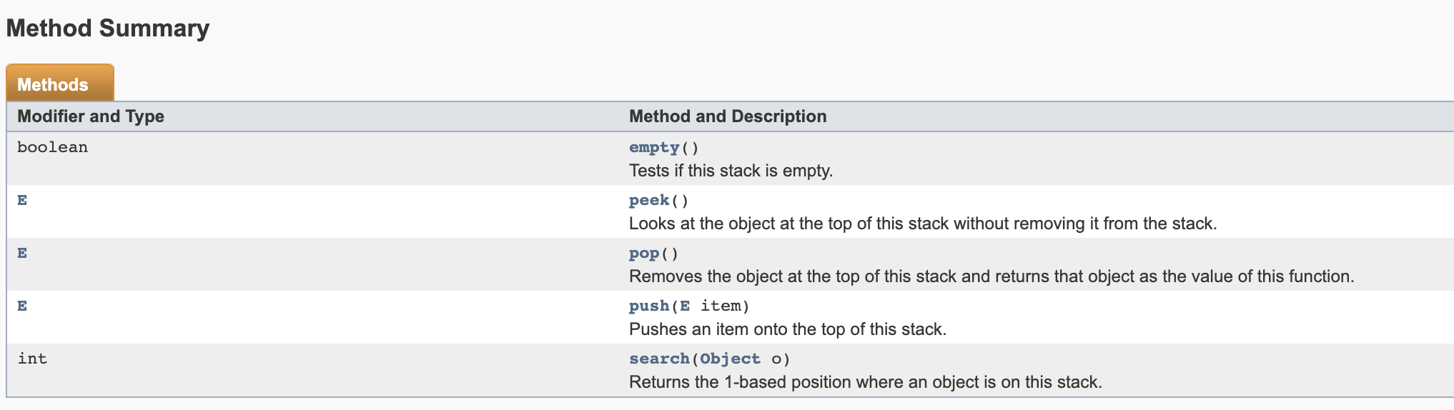 Stack class에는 5개의 메서드가 정의되어 있는데, 어떻게 쓰이는지 예시로 살펴보겠습니다.