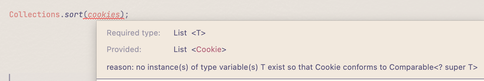 이렇게 컴파일 에러가 발생합니다. 왜냐면 Cookie class에 Comparable를 implements 해주지 않았기 때문입니다.