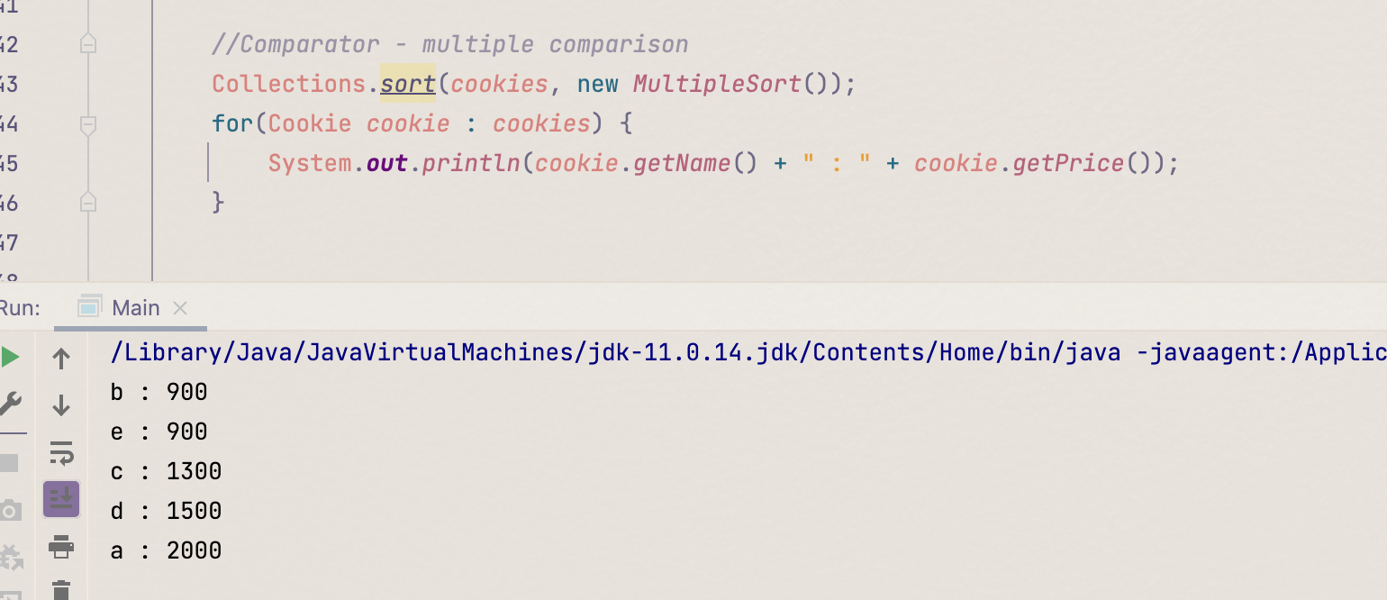 제대로 결과가 나오는지 확인하기 위해서 Cookie e = new Cookie("e", 900, 5) 를 추가해줬습니다. b와 동일 price인데 b보다 먼저 cookies list에 추가가 되어있을 때도 의도한대로 나오는지 보겠습니다.