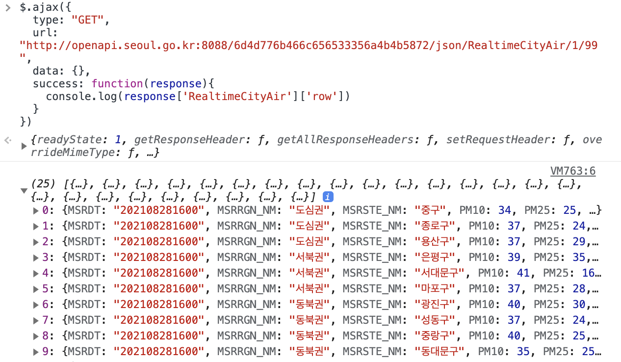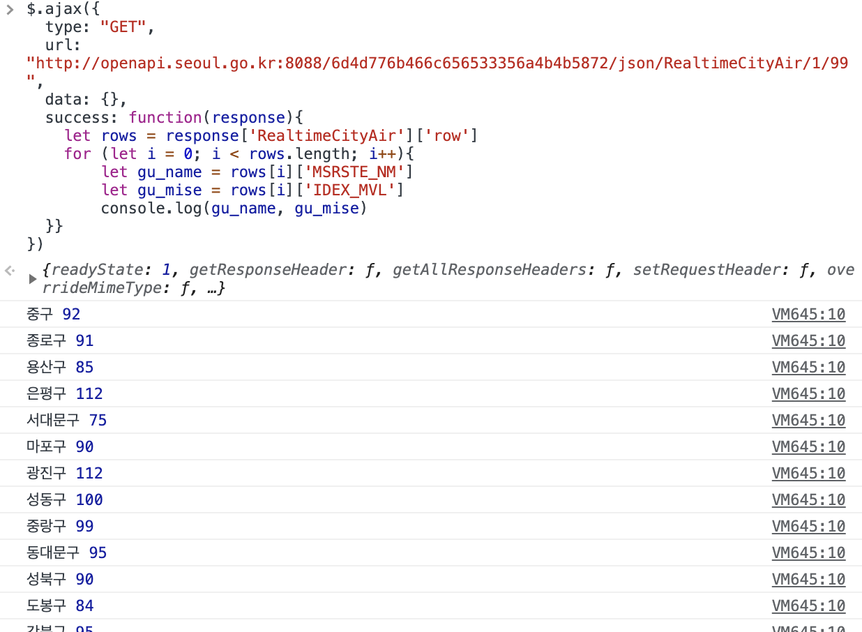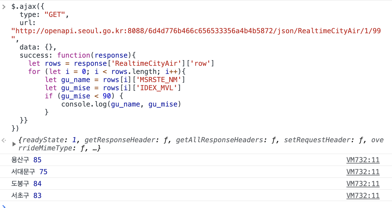 이렇게 for 문을 사용하여 rows 안의 구 이름과 해당 구의 미세먼지 농도만을 읽어낼 수 있습니다.