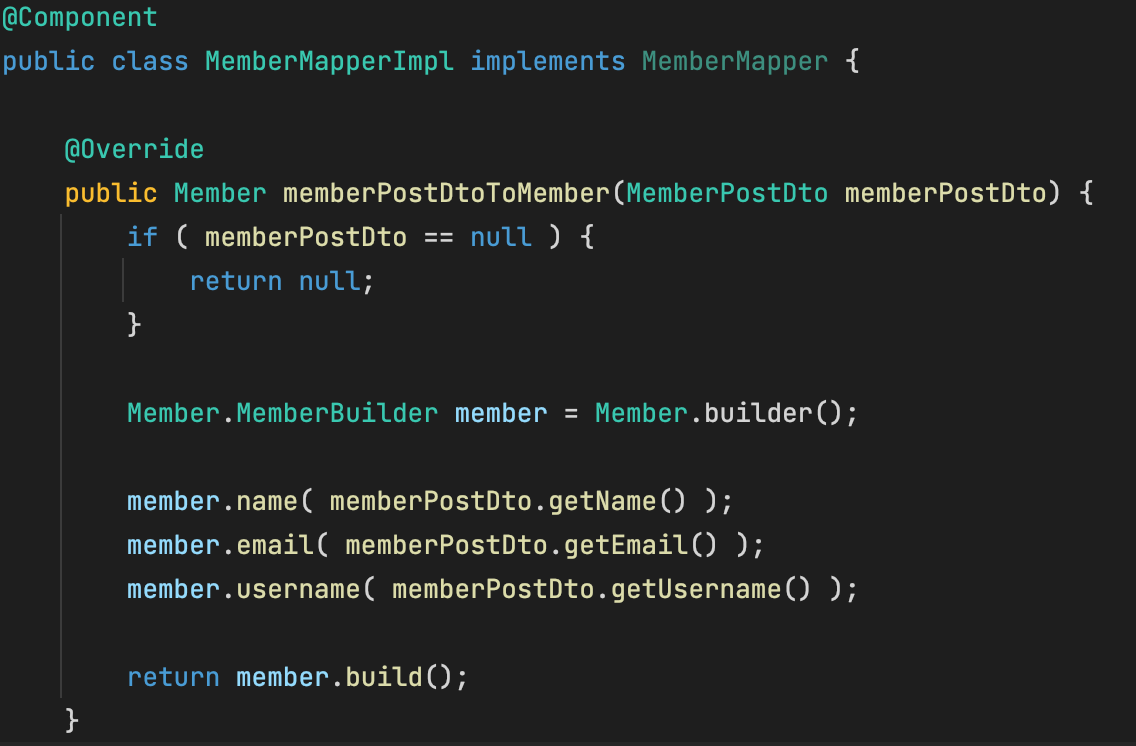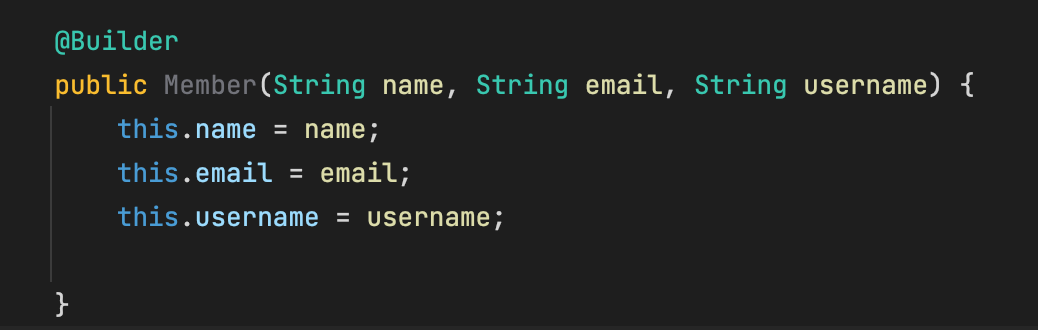 제가 만든 Member Entity는 @Entity가 붙어있었기에 필수적으로 @NoArgsConstructor가 있어야 했고, builder가 없었기 때문에 NoArgsConstructor로 mapping이 되었던 것입니다.