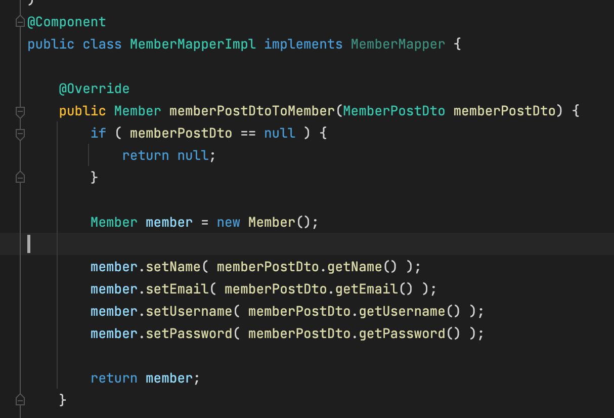 그때까지만 해도 Mapstruct가 Constructor의 parameter 수를 보고 먼저 채택하는 constructor가 있다는 생각은 하지 못하고 setter가 없어서 parameter가 없는 constructor만 사용이 가능한가 보다라고 생각해서 setter를 만들었습니다. setter를 만들었더니 아래 나온 것처럼 되기는 되는데, 내가 정의한 constructor를 사용한 것이 아니라 의도되로 된 것 같지 않아 이상했습니다. 아니나 다를까 만들었던 constructor에서 password parameter를 제거하고 몇 번이고 build를 새로 해봐도 setPassword까지 mapping되는 것이 확인되었습니다.