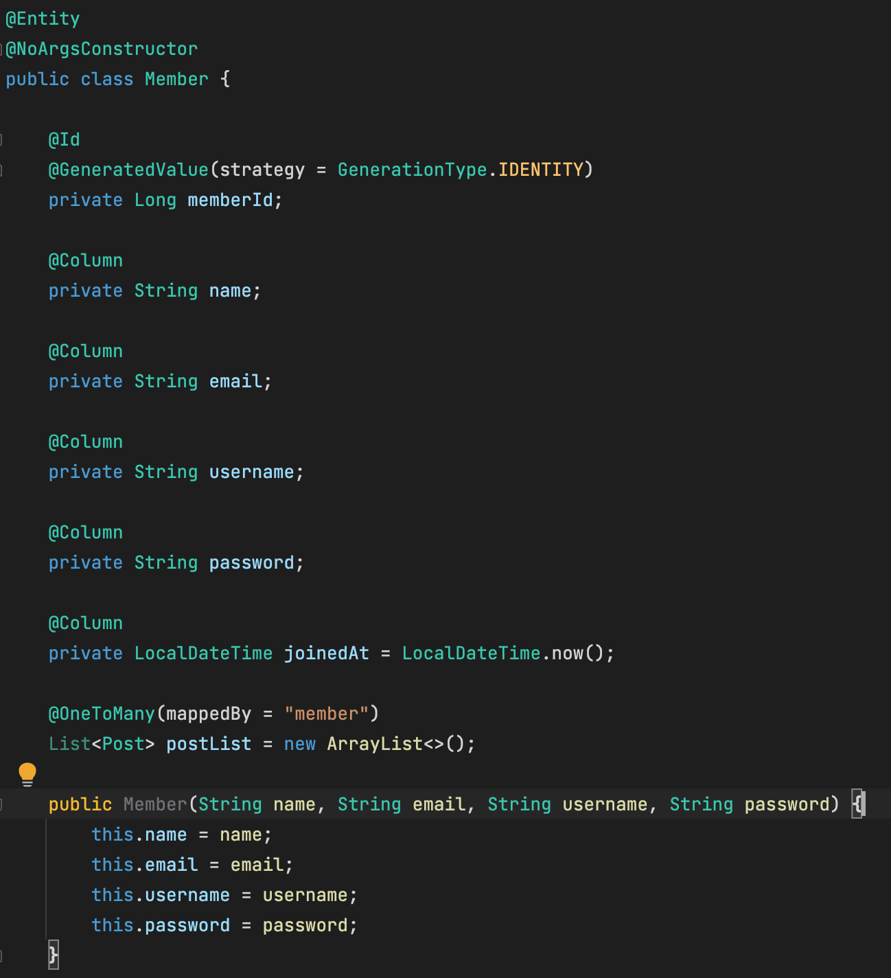 처음 Entity code는 아래와 같았습니다. @Entity를 사용했기 때문에 @NoArgsConstructor가 필수로 들어가야해 붙여주었습니다. 그리고 사실상 제가 원하는 PostDtoToEntity 시에는 아래에 parameter를 4개 갖는 constructor 형태를 이용해 mapping 되기를 원했습니다. 빌드를 해보니 mapping은 제가 원하는 constructor가 아니라 No parameter consturctor로 이루어졌습니다.