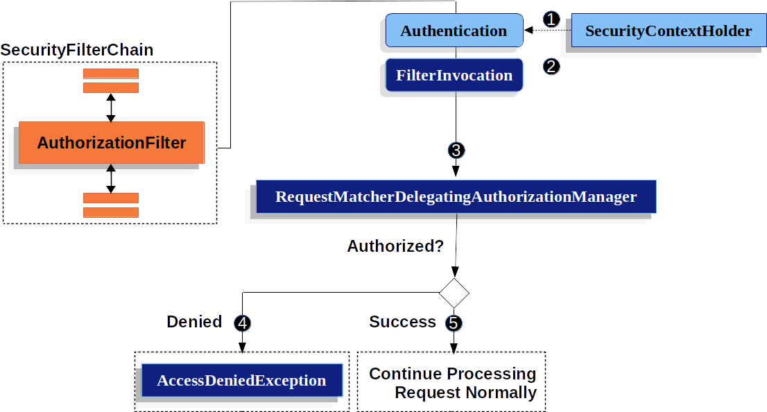 Process를 한 번 살펴보니, FilterInvocation을 SecurityMetaDataSource로 보내 ConfigAttributes들을 얻어내는 과정이 없어졌습니다. 그리고 AccessDecisionManager가 아니라 RequestMatcherDelegatingAuthorizationManager가 사용자의 권한 여부를 판단합니다. 이 때 Authentication과 FilterInvocation만 AuthorizationManager에게 보내주면 됩니다.