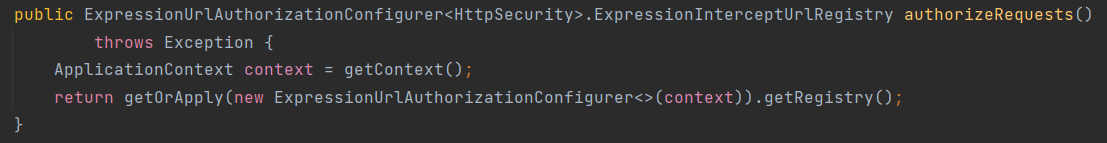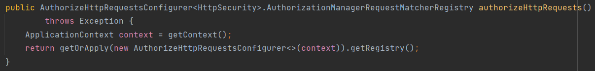 method가 하는 역할은 위의 .authorizaeRequests()와 동일합니다. 다만 method의 return type이 여기서는 AuthorizationManagerRequestMatcherRegistry네요. 권한처리를 해주는 RequestMatcherDelegatingAuthorizationManager가 delegate하는 request matcher를 반환하는 것 같습니다.