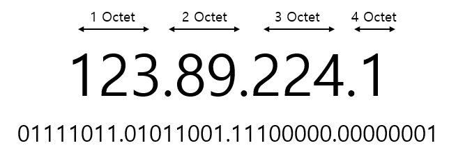 : IP 주소는 " . "으로 구분된 4개의 10진수 입니다. 하지만 사실은 " . "으로 구분된 4개의 8bit(1byte)입니다. 즉, 8자리의 2진수 네개가 모여서 만들어진 주소입니다. 8자리의 2진수를 옥텟(Octet)이라고 부르며 곧 IP 주소는 4개의 옥텟으로 되어 있습니다.