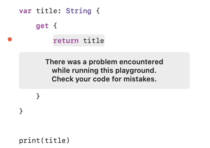 get만 명시하고 set은 따로 명시하지 않게되면 해당 property는 get-only가 됩니다. 그래서 해당 property의 값을 변경하려고 하면 경고 메세지가 compile time에 나타납니다.