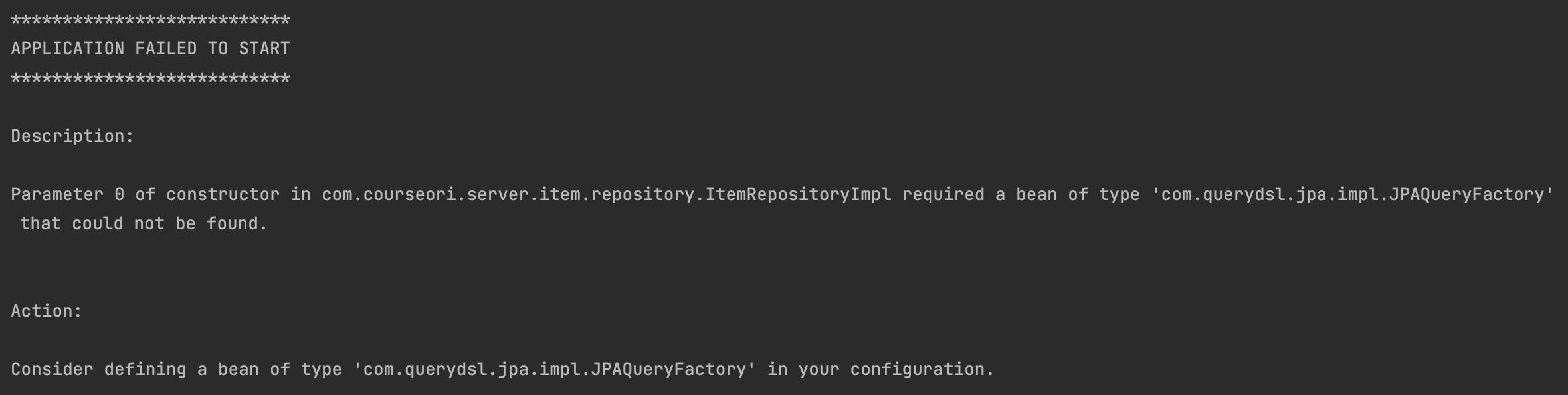 QueryDsl을 적용하고 애플리케이션 run을 하는데, "required a bean of type 'com.querydsl.jpa.impl.JPAQueryFactory' that could not be found." 라는 에러가 발생했습니다.