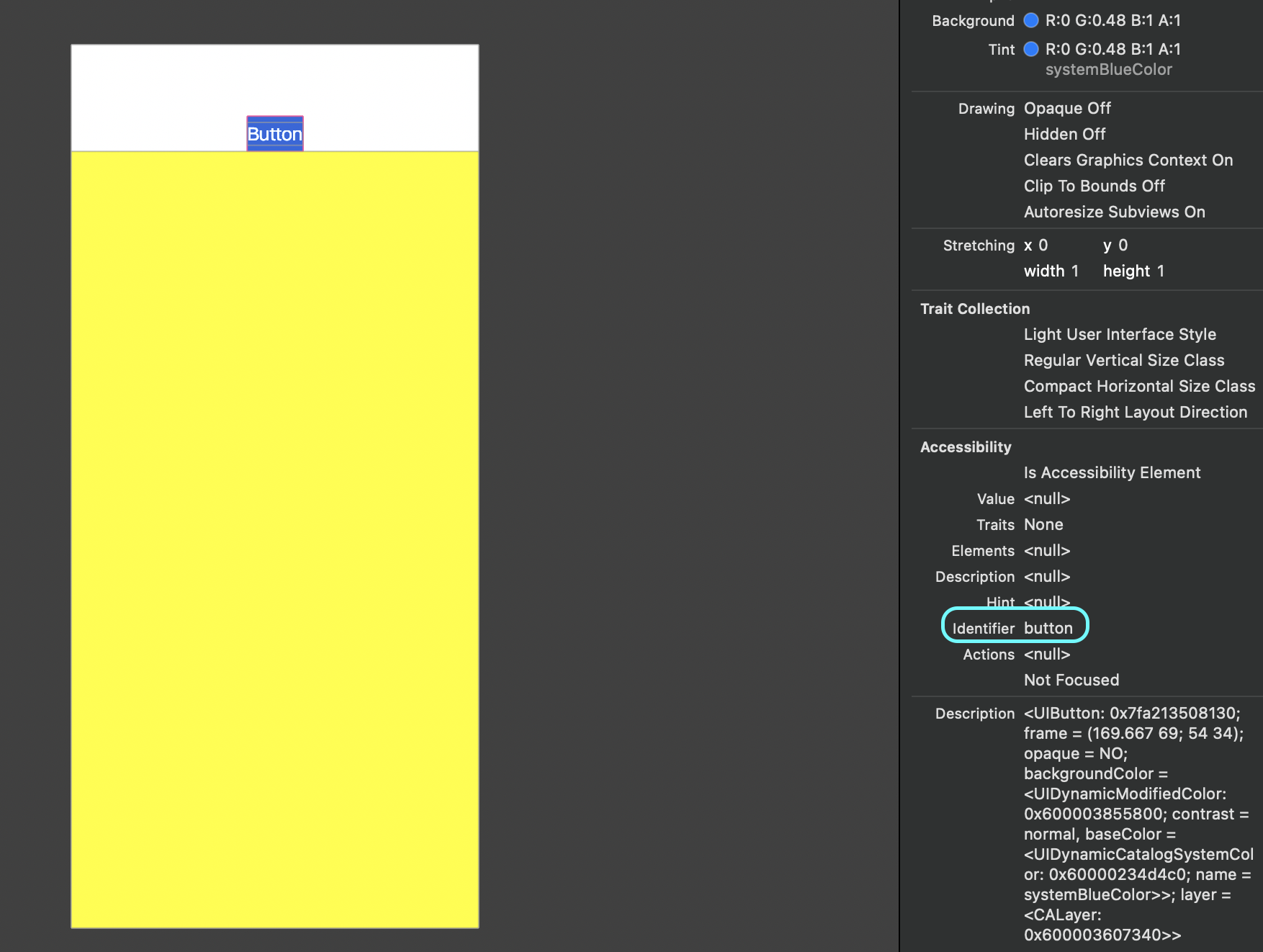위에서 button의 identifier를 "button"으로 설정해 주었는데, 위 사진을 보면 잘 설정된 것을 확인할 수 있습니다.