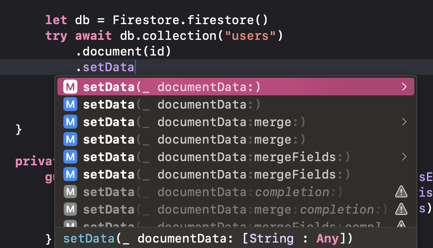 Firestore 메서드 중 setData는 argument로 dictionary 형태를 받는다. 이때, 저장하고자 하는 데이터가 객체라면 JSONSerialization을 이용해서 편리하게 Dictionary type의 객체로 변경하여 setData에서 사용할 수 있다. (해당 객체는 Encodable를 conform해야 함)