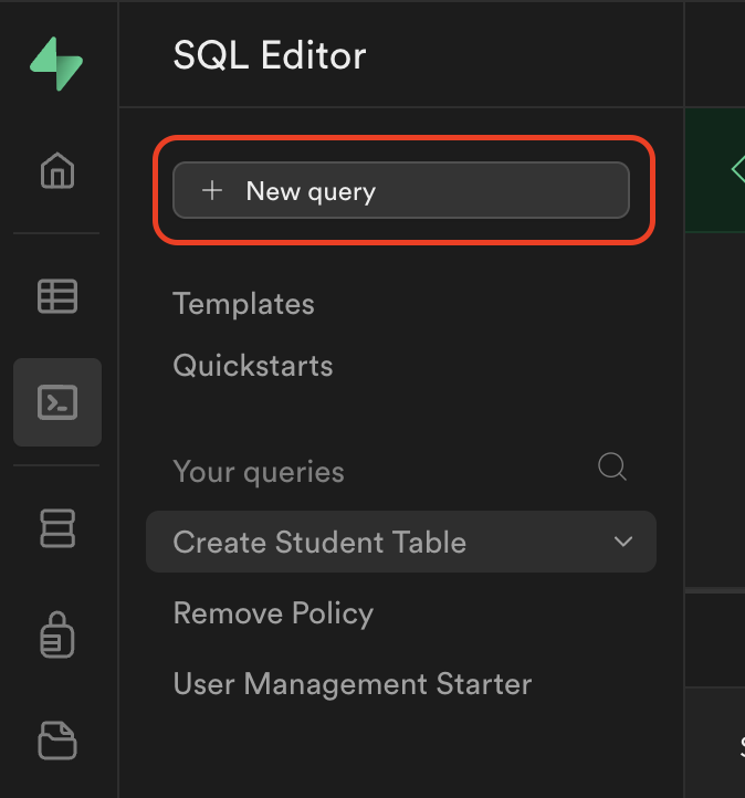 생성한 프로젝트로 들어가면 좌측 패널에 여러 아이콘이 있습니다. 아이콘 중에 terminal처럼 생긴 아이콘이 SQL Editor인데요, 그곳에서 모든 db query를 작성할 수 있습니다. Editor에서 table을 만들기도 하고, 지금 다루는 function을 만들기도 합니다. 뿐만 아니라, 생성한 table과 function을 바로 테스트해볼 수도 있어서 굉장히 편리합니다.