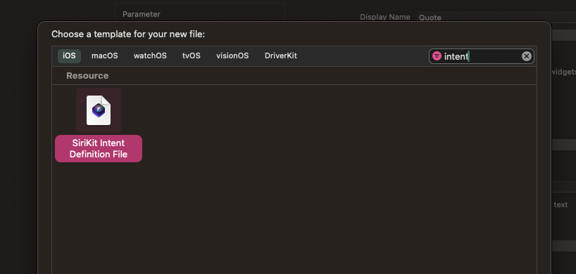 Widget에 SiriKit Intent Definition File을 추가해줍니다. 이름은 원하는 대로 지어주면 됩니다. (개인적인 팁으로,, 이름 마지막에 굳이 'Intent'라고는 명시하지 않아도 될 것 같습니다. 저는 추가했었는데, 그렇게 하니까 나중에 자동으로 생성되는 intent 클래스 이름에도 suffix로 intent가 붙어서 000IntentIntent가 되어서 보기 별로 안좋더라구요. :o )