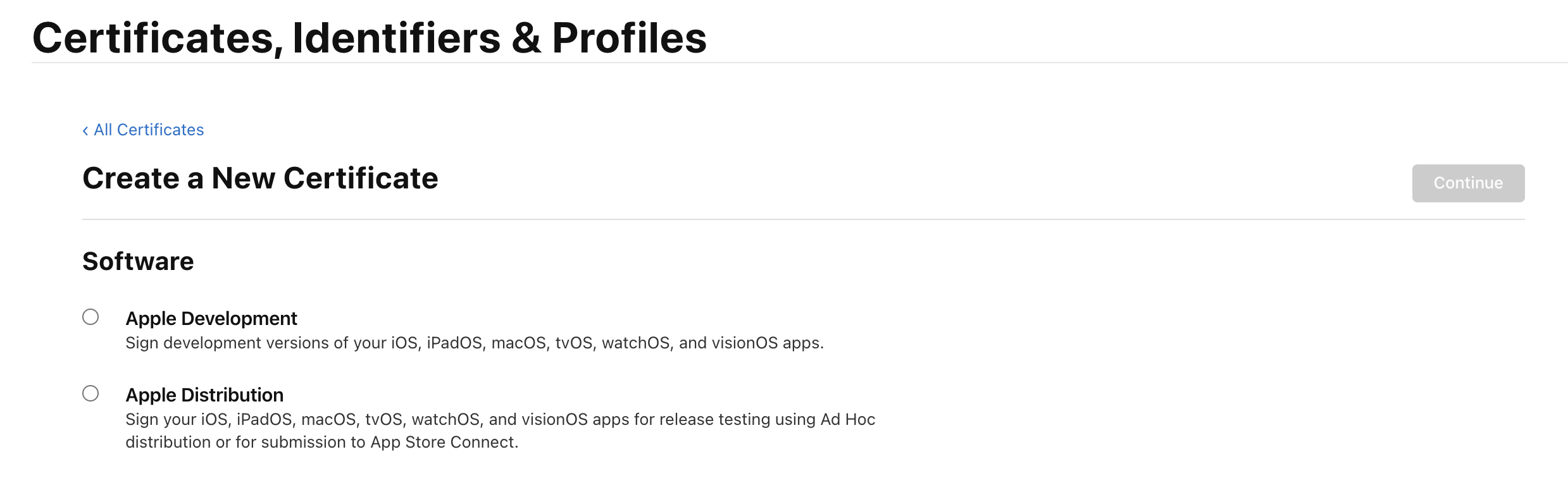 이제 apple developer의 Certificates, Identifiers & Profiles로 가서 필요한 certificate을 생성해줍니다.