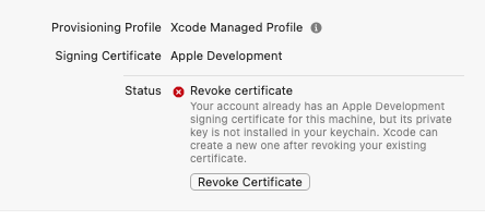 Your account already has an Apple Development signing certificate for this machine, but its private key is not installed in your keychain. Xcode can create a new one after revoking your existing certificate