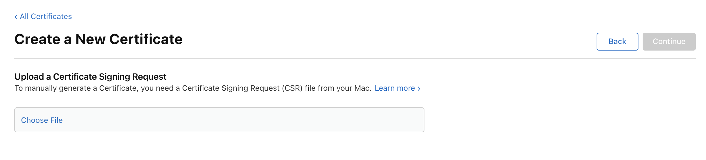 위 화면에서 원하는 certificate 종류를 선택해주고 continue하면 `certSigningRequest`를 업로드할 수 있는 화면이 나옵니다.