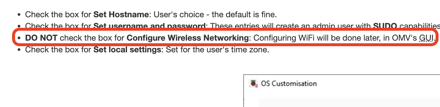 그랬더니.. 바로 Raspbian 설치 때부터 문제가 있었다는 것을 알게되었습니다. 제 방에 NAS를 둘 생각이었기 때문에 wifi를 사용하는 것으로 설정을 해서 설치했었는데, WIFI 설정을 하지 말아야 한다고 주의사항에 딱 쓰여 있더라구요. 그것을 모르고 wifi로 했으니, 중간에 설치가 멈췄던 것이었습니다. 그래도 원인을 알아서 다행이라 생각하며 raspbian를 지우고, 이번에는 wifi 설정을 하지 않도록 다시 설치했습니다. 이미 여러번 해서 금방 할 수 있었습니다. (🥲)