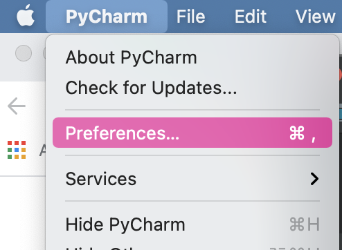 1)맥북의 경우 "파이참 -> Preferences" 로 들어갑니다.