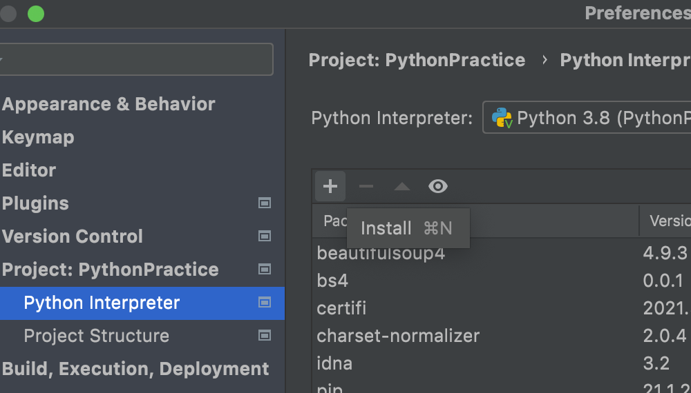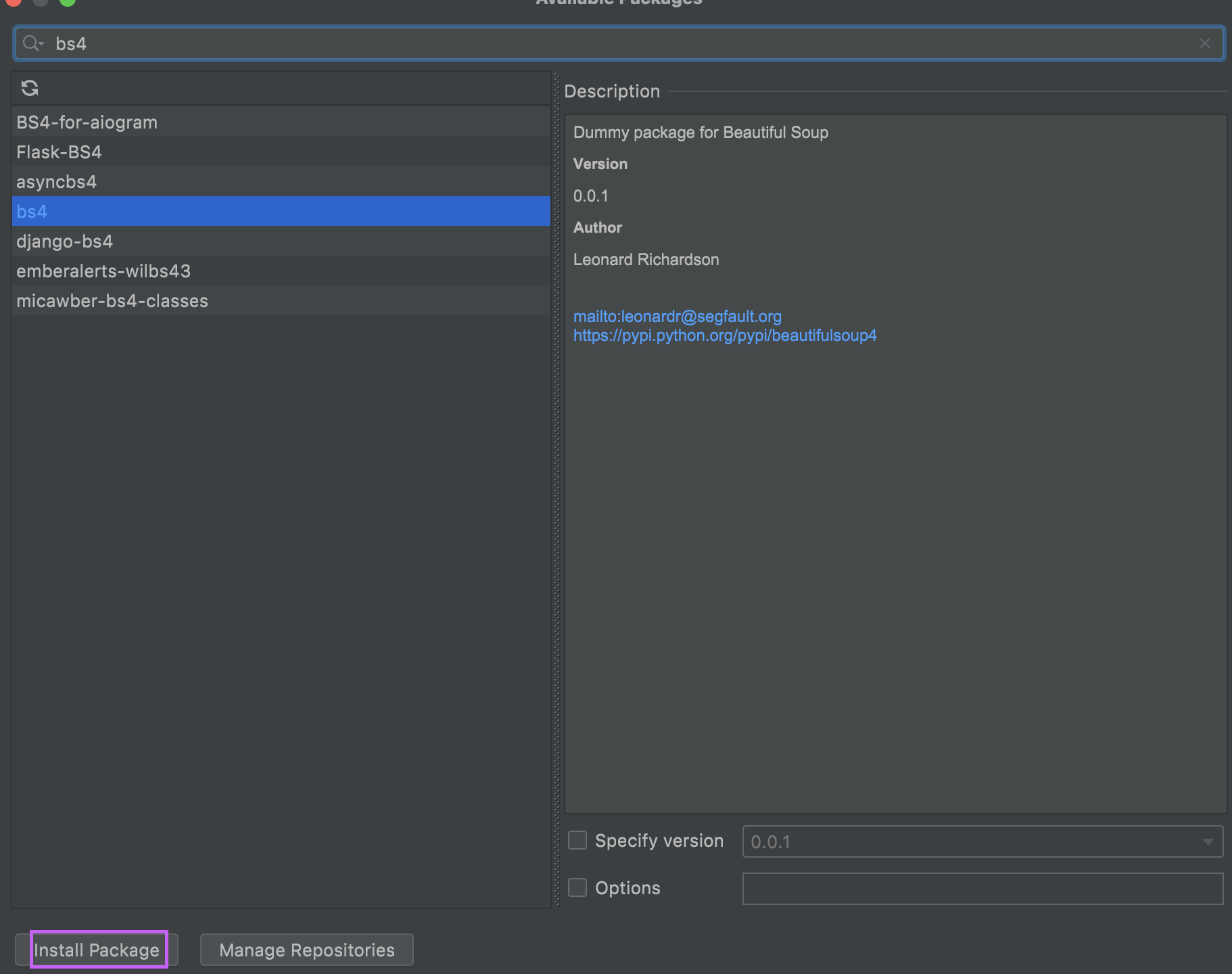 3)검색창에 "bs4"를 입력하고 하단의 "Install Package"로 다운받아 주면 끝!