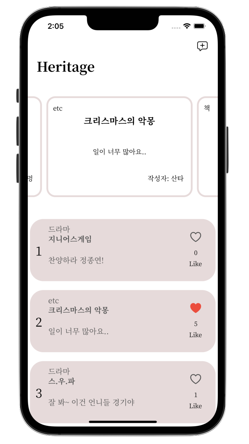 UITableView가 베이스가 되었고, 0번째 행에는 CollectionView를 넣어 가장 좋아요 수가 높은 게시글이 나오도록 하였습니다.