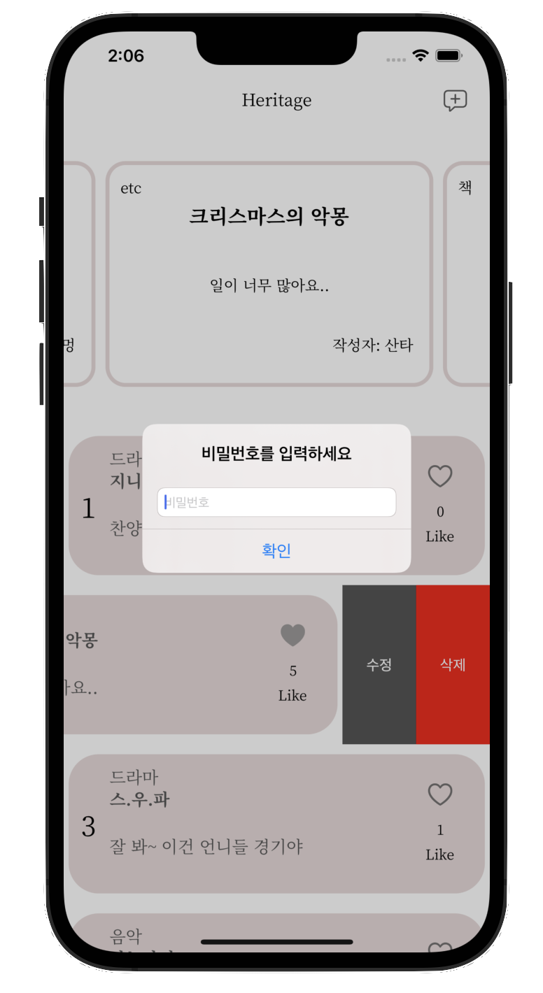 글을 작성한 후에 글쓰기 버튼을 탭하면 해당 글이 API로 POST되고, 메인 뷰컨트롤러로 전환되면서 tableView를 reload하여 게시판에 새 글이 나타나도록 하였습니다. 올린 글을 수정하고자 할 때에는 글을 스와이프 하여 수정할 수 있습니다. 대신 글 작성시에 입력했던 비밀번호가 맞으면 수정화면으로 넘어가고, 틀리면 비밀번호 재확인 요청을 받습니다. 수정을 할 때는 PATCH를 사용해서 이미 API에 POST되었던 데이터의 일부만을 수정하도록 하였습니다. 삭제를 원할 때에도 역시나 비밀번호 확인을 받고, 비밀번호가 맞으면 삭제가 가능합니다.