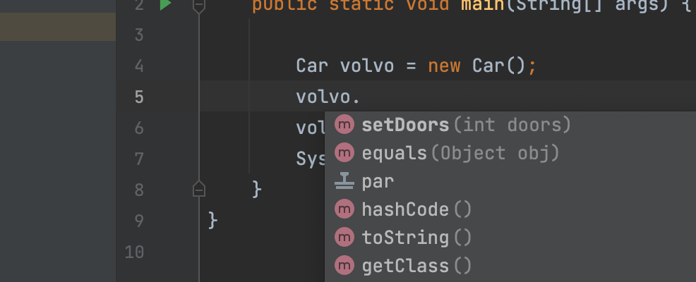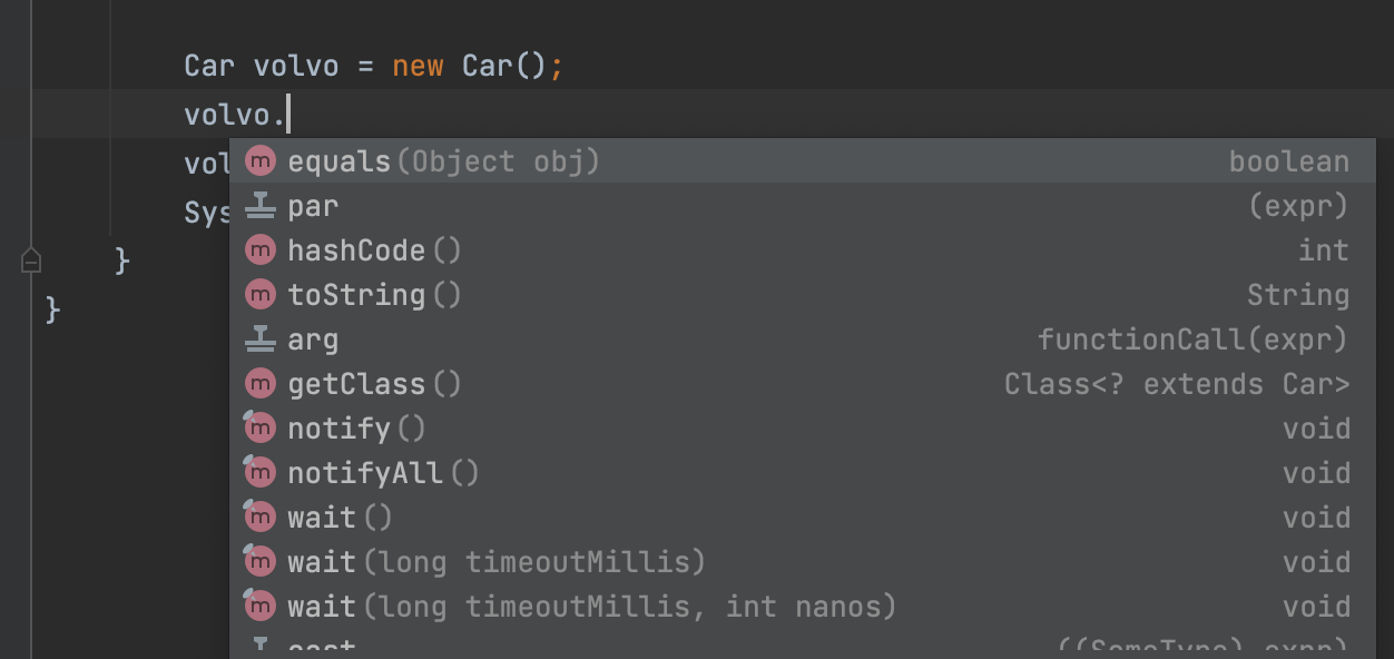 그리고 객체를 생성하면 Java에서는 자동으로 몇 가지 기능을 부여합니다. 한 번 확인해보기 위해 생성한 객체인 volvo에 이어 '.' 을 찍어보면, 여러가지 기능들이 이미 추가되어 있음을 알 수 있습니다. 이 기능들은 Java에서 자동으로 부여를 하는 것(Base Java class에서 Car class가 inherite 해 온 기능들입니다.)이고 우리가 원하는 기능을 만들 수도 있습니다.