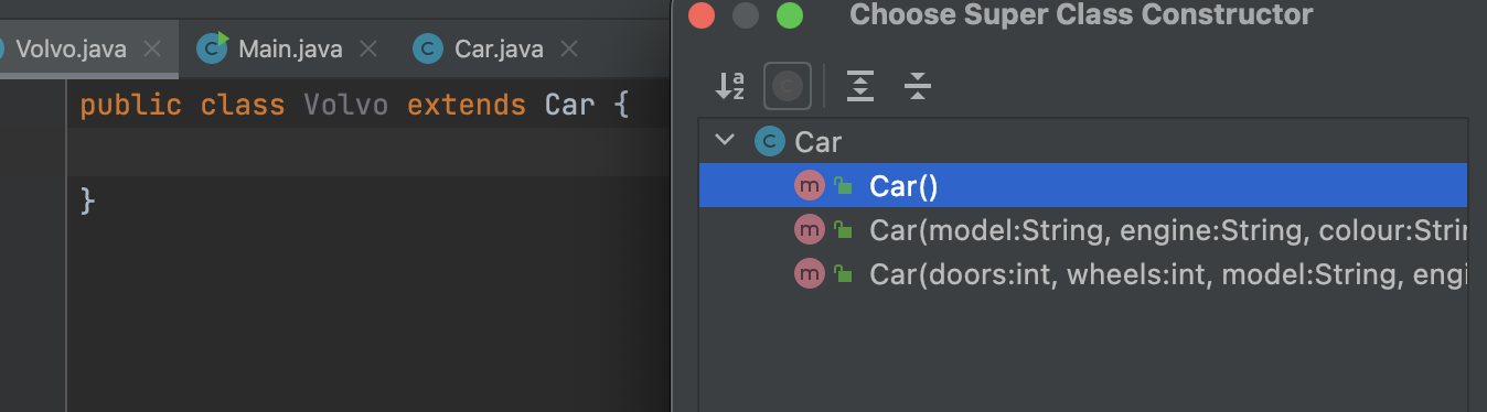 Volvo는 Car class를 상속하기 때문에 Car가 가지고 있는 fields나 methods를 모두 사용할 수 있는 것입니다.