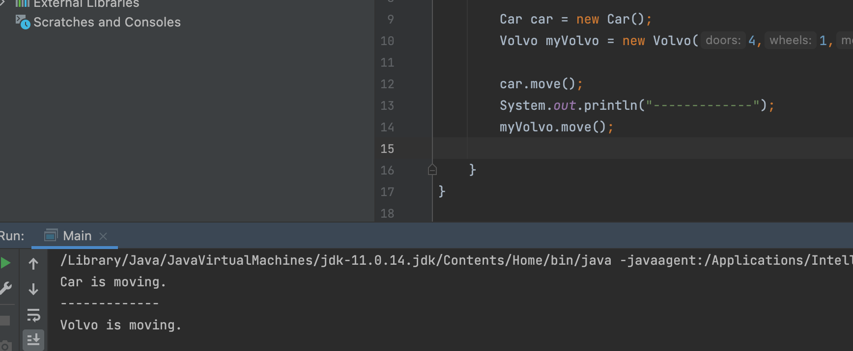 Main에서 Car와 Volvo class로 각각 하나씩 objects를 만들어주고 move() method를 호출하였습니다.