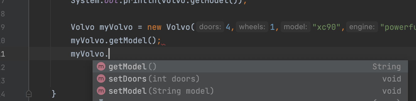 Volvo myVolvo = new Volvo(4,1,"xc90","powerful engine","white",true,1);