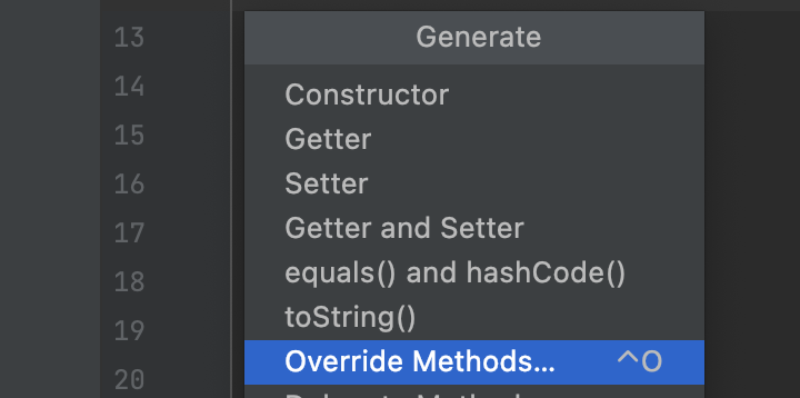 Generate 리스트 중에 Override Methods가 나와있고, 클릭하면 override가 가능한 함수 목록이 나타납니다.