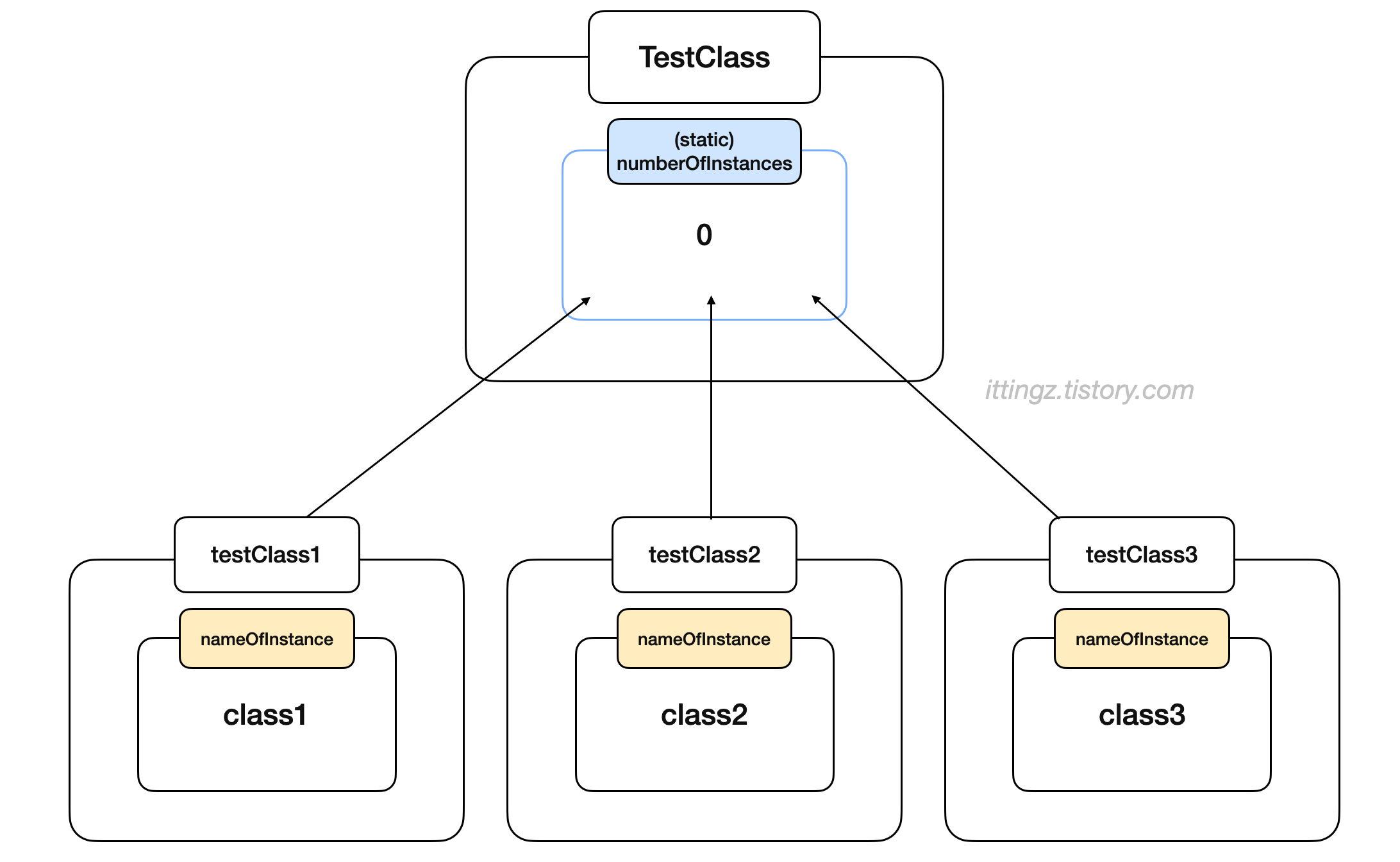testClass1, 2, 3 모두 static field의 value는 공유하고 있습니다. 반면에 non-static field는 각각의 instance에 속해있는 것을 볼 수 있습니다. 위에서 언급했던 static의 특징인 "class의 instance 보다는 class 자체에 속함"이 어떠한 의미인지 이제 좀 와닿으시죠?