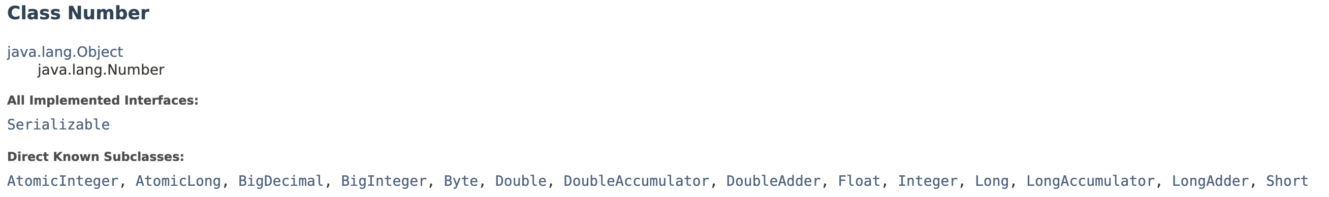 T 자리에 Number class를 extends하는 친구들만 올 수 있도록 하였습니다. Number class는 Integer, Double, Float 등 우리가 익숙하게 알고있는 primitive type의 wrapper class들이 extends하고 있습니다. 그 말은 곧 T 자리에는 숫자 type만 올 수 있게 되는 것입니다. String이나 Number class를 상속하지 않은 class는 올 수가 없게 되는 것이죠.